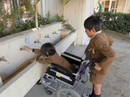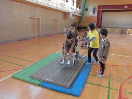 1・2時間目に、此花ふれあいセンターの方による、車いす体験を行いました。初めて車いすを見る・乗る・押す児童が多く、みんなとても興味津々でした。