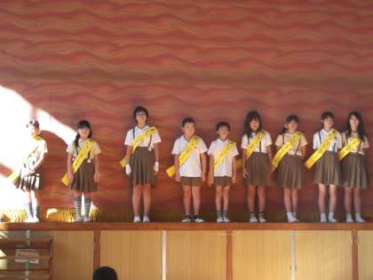 10月21日〜25日に代表委員会を中心に、朝のあいさつ運動が行われます。今日の児童集会で、集団登校班ごとに「あいさつ隊」を募集しました。