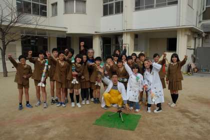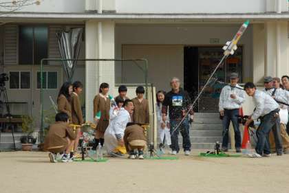 卒業した6年生が,石田靖さん演ずるドクと,この日が初登場となるエデンちゃん,こりんちゃん,そしておなじみの犬のべんけいと一緒に,ペットボトルロケットを研究して打ち上げました。