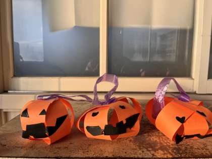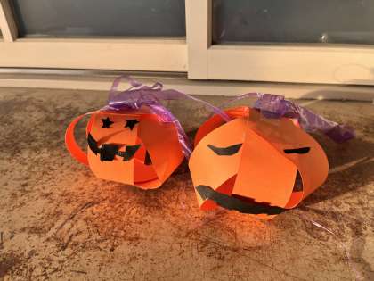 図工の時間に、画用紙を使ってジャック・オー・ランタンを作りました。いろいろな顔に仕上げて自分だけのジャック・オー・ランタンができました。