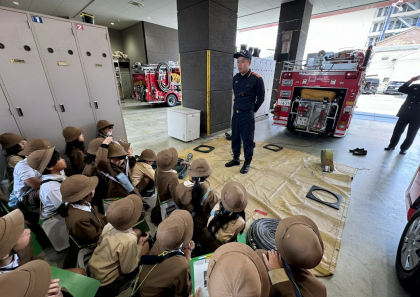 はじめに、消防署の方から火事についてのお話があり、火事の怖さや火事が起きた時にどうすればよいのかなどを学習しました。
