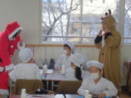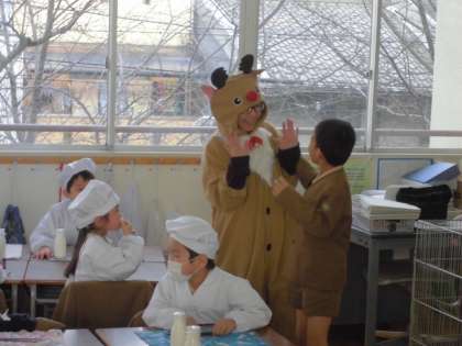 給食時間,四貫島小学校にトナカイとサンタと妖精がやってきました!