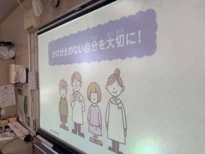 薬剤師さんにお越しいただき、普段使っている薬を飲むときにはどんな注意がいるのかなど詳しく教えてくださいました。実験を交えて楽しく学習できました。