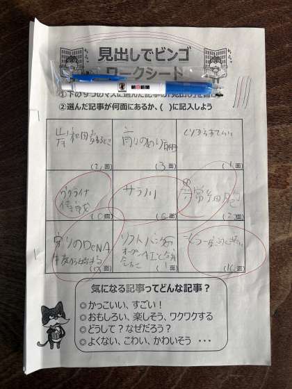 後半は新聞を使って見出しビンゴを行いました。たくさんの見出しがある中で、同じ見出しを選んでいる児童もたくさんいました。