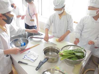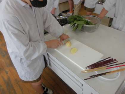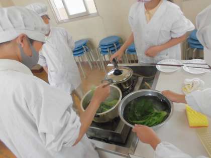 ほうれん草はゆでた後で切る、じゃがいもはゆでる前に切る、と考えながら班で協力してゆでることができました。