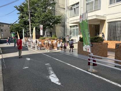 此花区青少年指導員により、あいさつ運動が行われました。元気のよい大きなあいさつの声が校門に響き渡りました。
