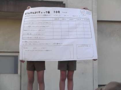 今週はそうじがんばり週間です。学校をきれいにしていくために、みんなで協力してそうじをします。そうじの時間の自分の様子を自分でチェック表に書き、「きれいにする」という意識を高めていきます。