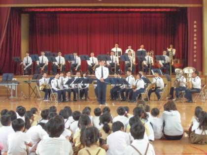 演奏会では,昔から演奏されている外国の曲をはじめ,AKBの曲やおなじみの曲も聴くことができました。楽器の紹介も丁寧にしてくださり,いろんな楽器が組み合わさって,1つの曲が演奏されていることがよくわかりました。また「フレッシュ・ウィンズ」の婦警さんたちのパフォーマンスに,演奏会が盛りあがり,子どもたちは大喜びでした。