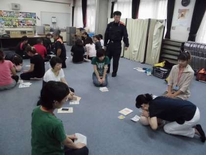 此花消防署の救急隊による「救命救急講習会」を行いました。たくさんの保護者も参加していただきました。
