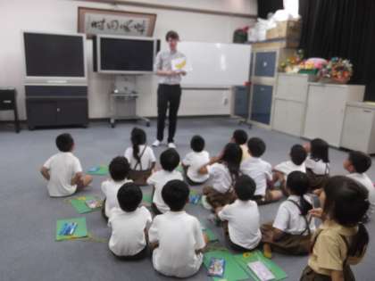 初めは緊張していた子どもたちでしたが、楽しいジャック先生の語りかけで、いつのまにかノリノリで活動していました。発音もきれいでびっくりしました。