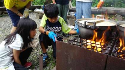 初めての火起こしは苦労していましたが,煙や熱さにも負けず頑張っていました。