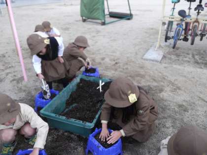 「形がたまねぎみたい。皮がつるつるや。」や「球根は土の匂いがするね。」など、五感を使って観察することができました。春にかわいい花が咲くのが楽しみです。