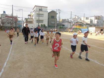1・2・3年生は、運動委員会のお兄ちゃん,お姉ちゃんの後ろについて、走るペースを合わせて走っています。
