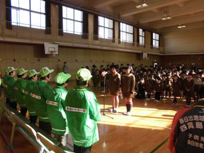 見守り隊・はぐくみ隊の方々は,暑い日も寒い日も雨の日も,いつも四貫島の子どもたちのために,道に立ってくださっています。その感謝の気持ちをみんなで伝える会です。