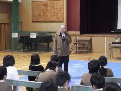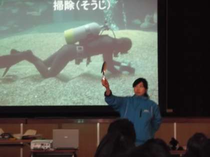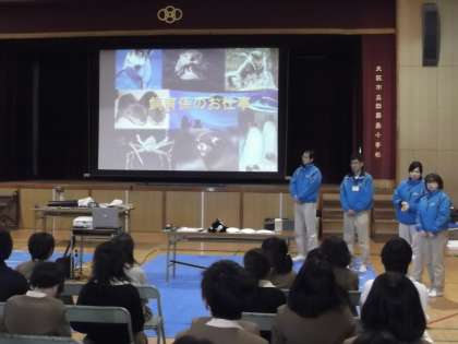 4・5・6年生対象に、海遊館の飼育係さんの出前授業がありました。飼育係の仕事は、エサを作るちょうじ(調餌)、エサをあげるきゅうじ(給餌)、すいそうなどをきれいにするそうじ(掃除)の「3じ」だそうです。そうじに使われる道具の紹介や、道具の体験をしました。