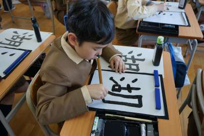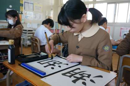 6年生になって初めての書写作品は,毛筆の「湖」です。