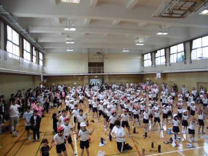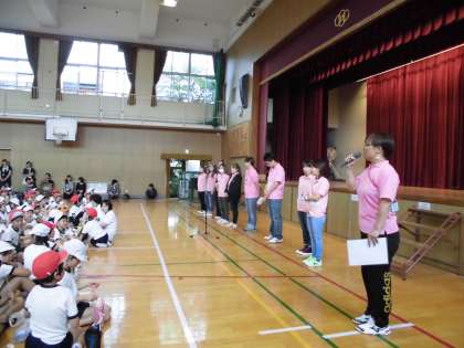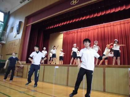 ダンスクラブのメンバーが前に出て「エビカニックス」を見本に踊りました。「エビカニックス」は,子どもたちがよく知っている踊りなので,ノリノリです。よい準備運動になりました。