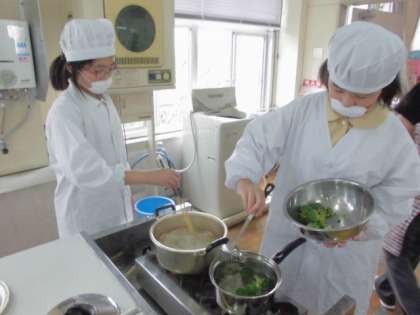 「お茶・ゆで卵・青菜・ゆで野菜サラダ」と実習も4回目。班で協力して、手際よく作ることができました。和風ソースも手作りして、おいしくいただきました。