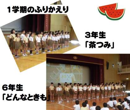 終業式では、読書貯金の表彰や、1学期のふりかえりを3年生と6年生がおこないました。ともにがんばったことや、元気な歌声が印象的でした。