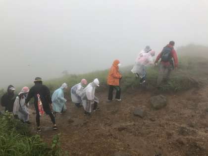 頂上での休憩のあと、あっという間にガスがかかり雨が降ってきました。