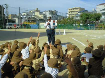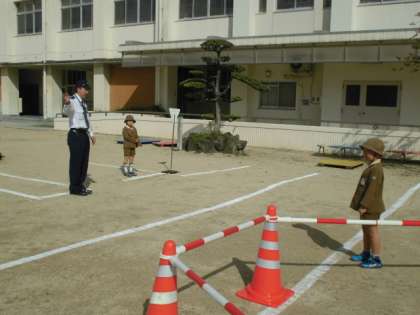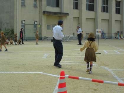 子どもの交通事故の原因1位はとび出しであること、だから左右の確認の大切さなどを教えてもらい、運動場にかかれた道路を実際に歩きました。