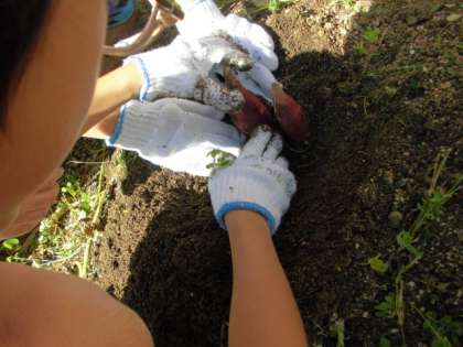 「うんとこしょ、どっこいしょ。」と言いながらツルを引っ張り、大きなサツマイモが抜けたら歓声があがりました。大きなサツマイモがたくさんできました。