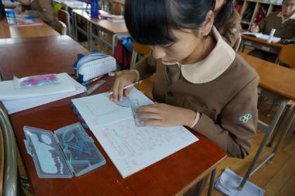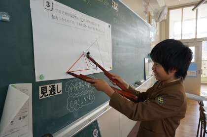 形が同じで大きさがちがう図形について調べたり作図をしたりする活動を通して,拡大図や縮図の意味や性質を学習しています。