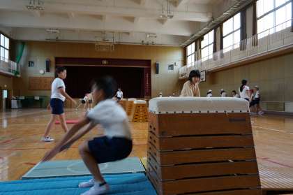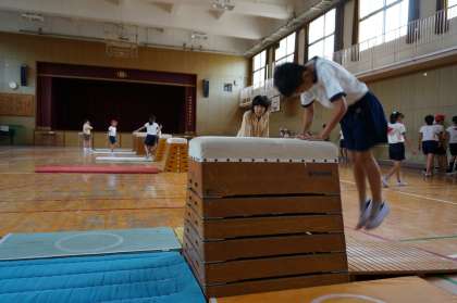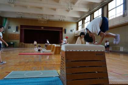 5年生のときは発展技として行っていた「台上前転」ですが,今年は全員が挑戦しました。