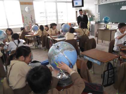 5年生は、地球儀や世界地図・国旗を見ながら、世界の中の日本を考えていきました。地球儀で国をさがしている様子は、とても楽しそうでした。