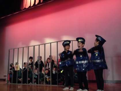 2年生の子どもたちが,かわいいどろぼうになりました。毎日大どろぼうになるための修行を積む様子が,とてもおもしろく,上手に演じていました。