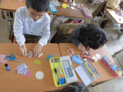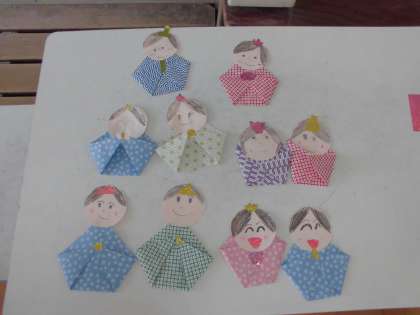 折り紙で丁寧におり、かわいらしいおだいりさまとおひなさまをつくることができました。