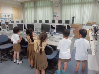 学校探検をしています。今までに、理科室、パソコン室、放送室、音楽室、四貫島の森などいろいろなところを探検しました。見つけたものを、生活科ワークに絵でかきました。