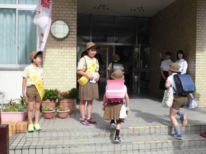 代表委員会の児童たちが、正門や各教室前に立って、あいさつをしています。