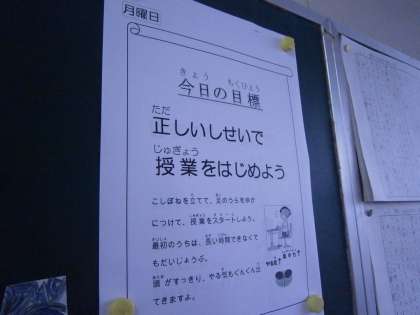 これから毎日,「今日の目標」が出されます。ちなみにこの日の目標は,「正しいしせいで授業をはじめよう」でした。みなさん,できたでしょうか。お家でもできているかチェックしていただきたいです。よろしくおねがいします。