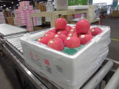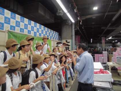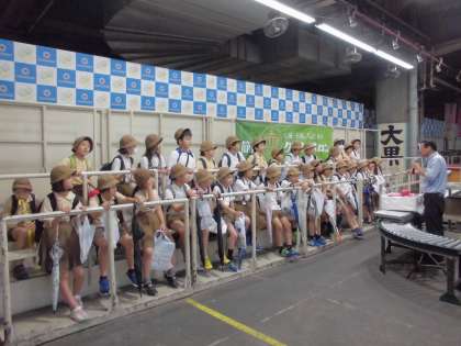 社会見学で中央卸売市場に行ってきました。食べ物の流通を勉強します。果物のせりの様子を実際に体験しました。現在の「ふじ」リンゴ36個入り10kgの値段を考えます。指を使って値段をつけます。正解したのでリンゴをお土産でいただきました。