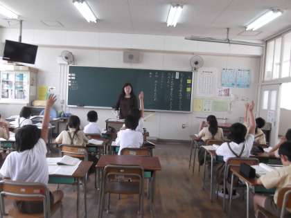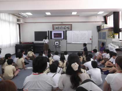 6年生は5年生に林間学習の事前指導をパソコンを使って、プレゼンしました。話だけでなく、歌やスタンツも体験してもらいました。
