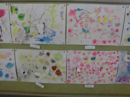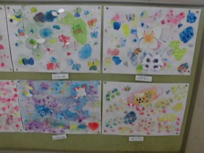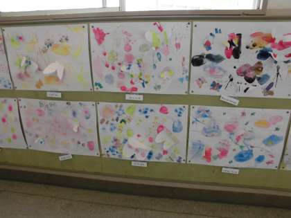 図工の授業で、絵の具を使ったいろいろな技法を学習して、作品を作りました。「ドリッピング」(ストローで吹き流し)、「スパッタリング」(霧吹き)、「合わせ絵」などをしました。最後に蝶を描いて、合わせ絵も蝶の形に切り取り、貼り付けて立体的に仕上げました。どれも素敵な作品に仕上がりました。