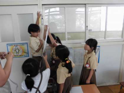 友達と協力して、机のたてと横、黒板の横の長さ、とびらの高さなどを紙テープに写し取りました。その後、長さ比べをしました。
