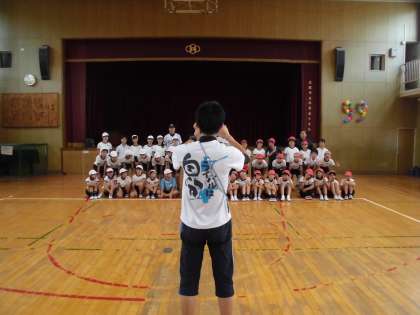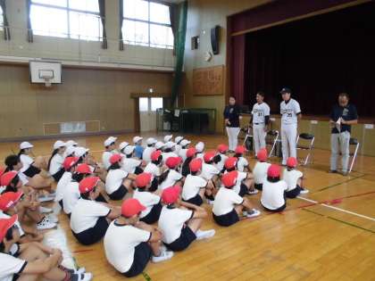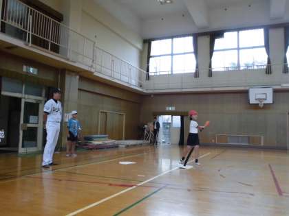 オリックスの少年野球のコーチの出前授業がありました。元プロ野球選手や元女子ソフトボール日本代表選手ということもあり、体も大きく子どもたちも驚いていました。5年生対6年生でティーボール対決をしました。結果は…。ホームランも飛び出し盛り上がりました。
