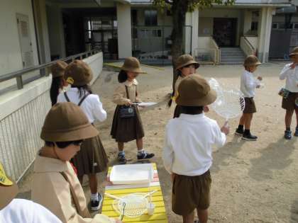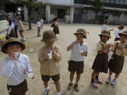 シャボン玉をしました。束ねたストローやうちわを使って、いろいろなシャボン玉を楽しみました。