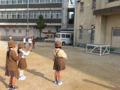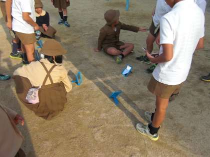 手鏡を使って、日光をはね返して的に当てる活動をしました。友だちと協力して、鏡ではね返した日光の筋をつくった人もいました。