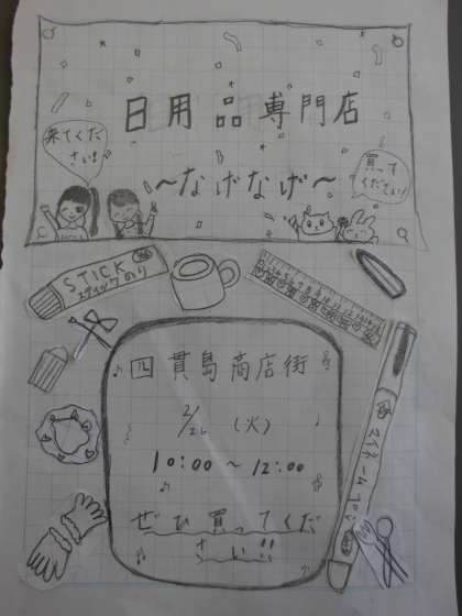 キッズマートの開催店のチラシです。2月26日(火)10時〜12時です。場所は四貫島商店街。日用品、お菓子、野菜の3店舗が出店します。お時間のある方はぜひお越しください。