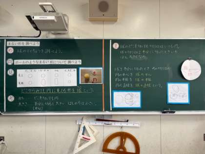 算数科「円と球」の学習では、身の回りの丸い形を見つけたり、コンパスを使ったりして、円や球の特徴を調べました。