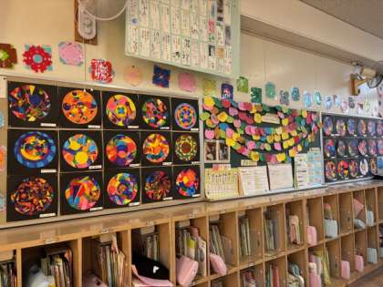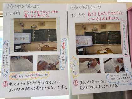 教室にはコンパスで描いた「円のアート」や学習の様子をまとめた「学びの足あと」の掲示を行い、友だちの考えから学ぶ姿も見られました。