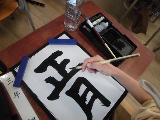 今回の授業では、一年の始まりに書く「書き初め」に挑戦しました。力の入れ方や筆の運び方が分かるように「とん」「すー」「ぐっ」と声を出して確認しながら学習を進めました。