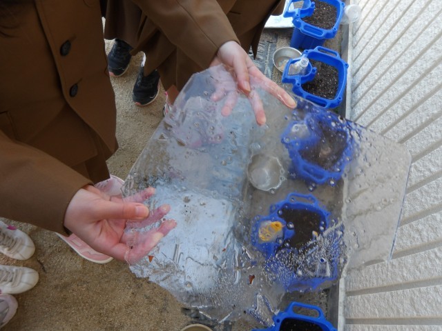 生活の学習で、氷づくりをしました。前日に水を張って準備をして次の日の朝に確認すると、「氷になってる!」という嬉しそうな声がきこえてきました。氷の中に落ちている葉っぱや木の枝を入れて凍らせたり、色水を凍らせたりいろいろチャレンジしました。