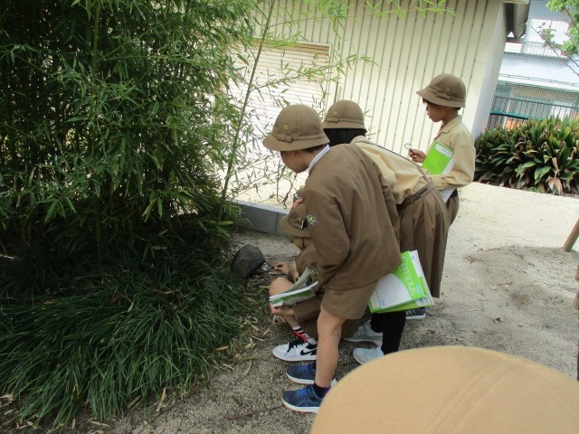 理科「生き物をさがそう」の単元で、四貫島の森に入って生き物や植物の観察を行いました。