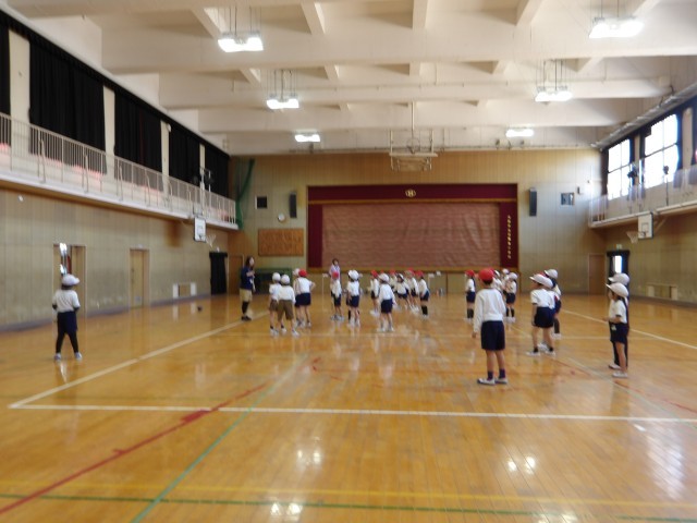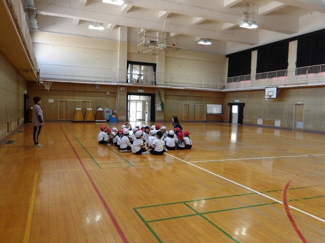 音楽に合わせて準備体操をして、ジグザグ走やジャンプを組み入れたサーキットトレーニングや鬼ごっこを楽しんでいます。