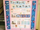 1号階段下の健康委員会の掲示です。手の汚れを実験で確かめ、手を洗おう!という呼...
