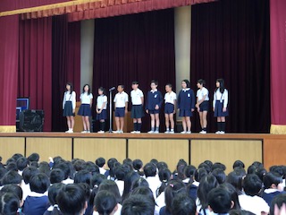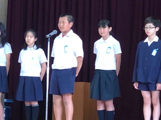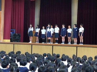 朝の児童集会で、委員会の代表として、委員長や副委員長が、全校児童の前で挨拶をしました。